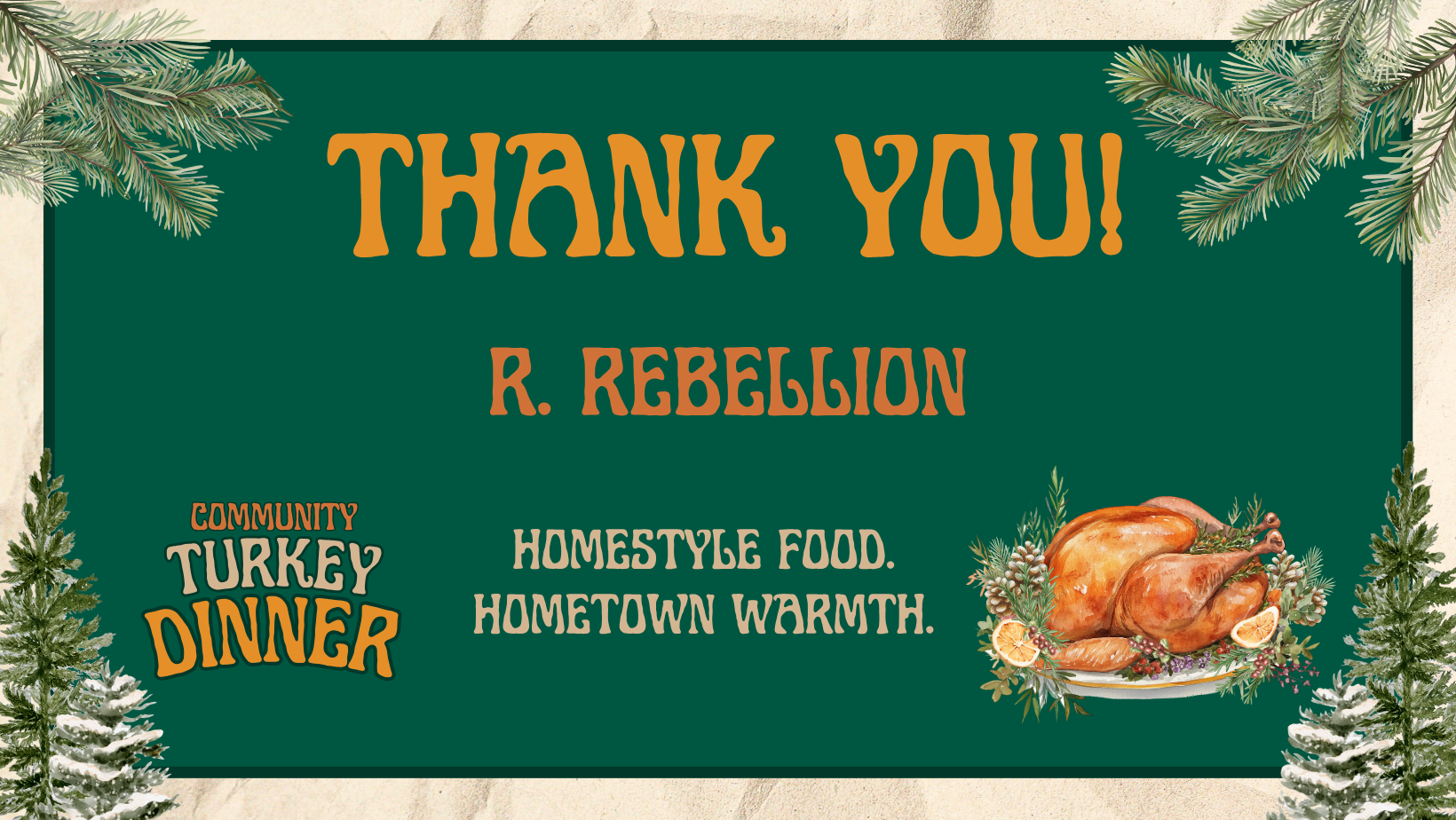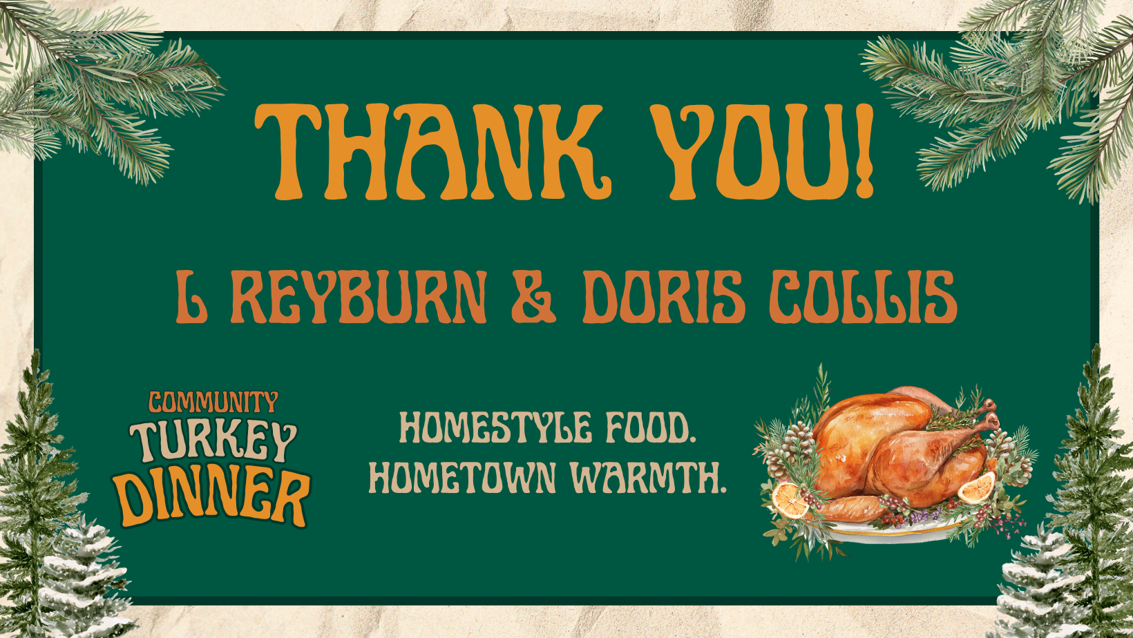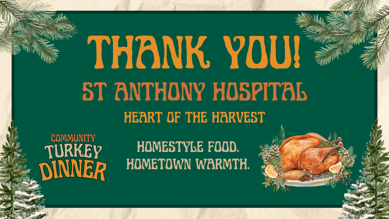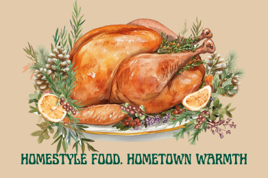 Please note: This year’s Community Turkey Dinner replaces our traditional Holiday Dinner typically held in December. We’re bringing the celebration forward to share the warmth a little sooner—with homestyle food, hometown spirit, and plenty of gratitude to go around.