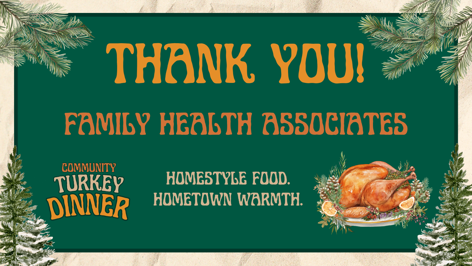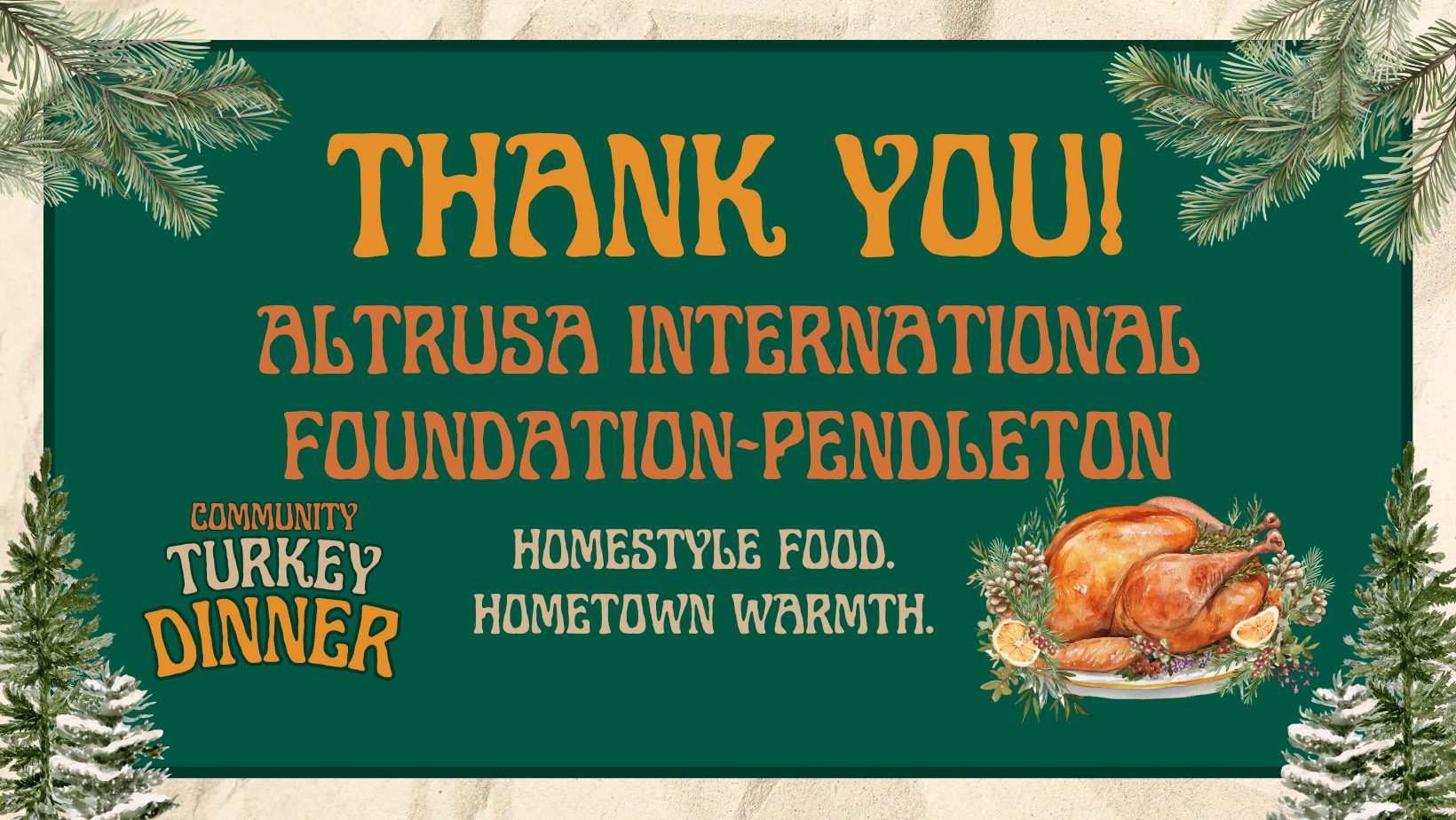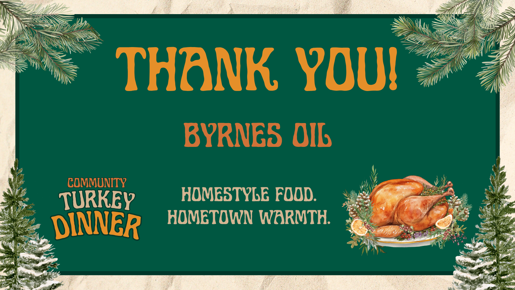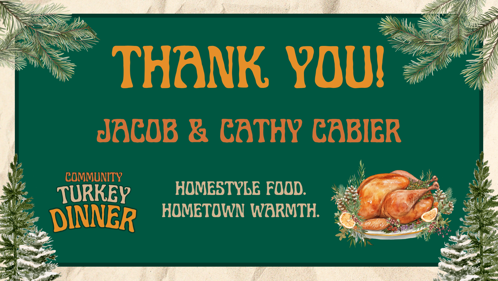 Please note: This year’s Community Turkey Dinner replaces our traditional Holiday Dinner typically held in December. We’re bringing the celebration forward to share the warmth a little sooner—with homestyle food, hometown spirit, and plenty of gratitude to go around.